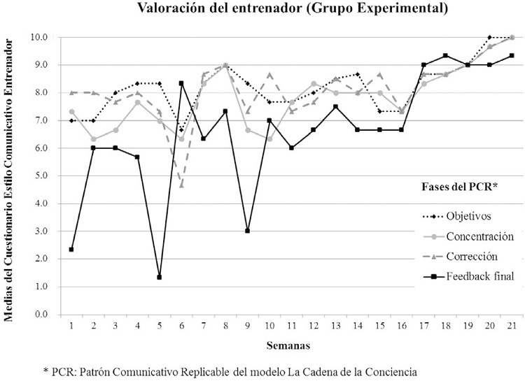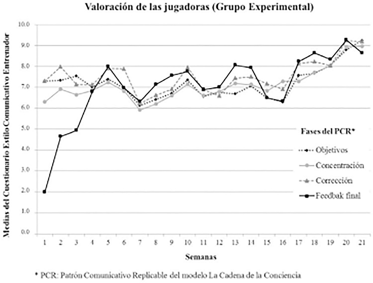 La evolución de la conducta comunicativa del entrenador del GE, registrada a lo largo de 21 semanas, muestra una tendencia global positiva. En la evolución percibida por las jugadoras, diferenciada por fases comunicativas del PCR (Figura 3), la fase de Feedback final es la menos puntuada al principio, si bien a partir de la cuarta semana se ajusta a la tendencia de las puntuaciones recibidas en las otras fases.