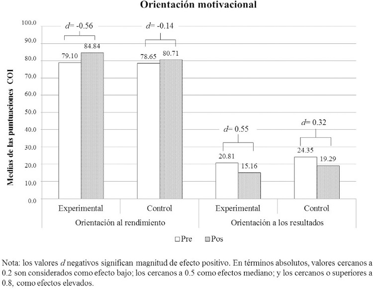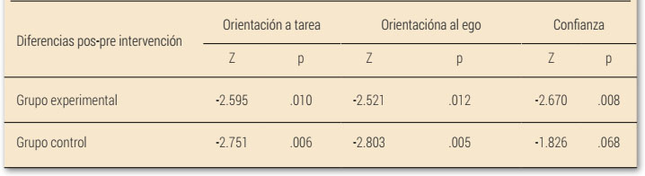 Después de la intervención, se observa un incremento de la orientación a la tarea y un decremento en la orientación al ego, en ambos grupos. Las diferencias entre antes y después son significativas para ambos grupos (Wilcoxon p < .05) y ambas orientaciones motivacionales (Tabla 3), si bien son más acusadas en el GE. Es al calcular la magnitud del efecto (d de Cohen) cuando encontramos grandes diferencias entre GE y GC. La magnitud en los cambios pre-pos del GE son moderados (d entre .5 y .8, en valores absolutos) en el incremento de la orientación a la tarea (-.56) y el decremento de la orientación al ego (.55). Por contra, los cambios en el GC son de casi nula magnitud (d < .2) en la orientación a la tarea (-.14) y de leve magnitud (d entre .2 y .5) en la orientación al ego ( .32).