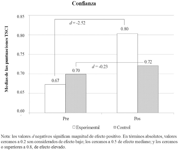 En la evaluación posterior a la intervención, se observa un incremento en los niveles de confianza, especialmente en el GE (Figura 6). Las diferencias son significativas para ambos grupos (Tabla 3), pero mientras que en el GE la magnitud de efecto es muy elevada (-2.52), en el GC la magnitud de efecto en los cambios observados es leve (-.23).