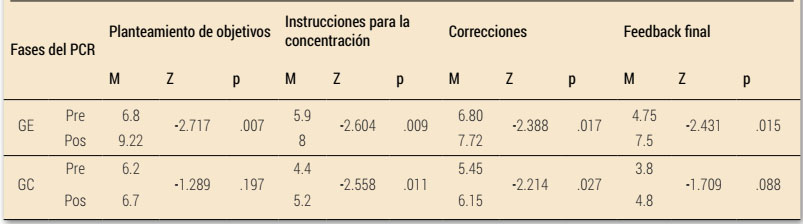 Las diferencias entre puntuaciones medias dadas por los jugadores de ambos grupos (Tabla 1) para ese mismo cuestionario, muestran una evolución positiva en ambos grupos y en todas las fases comunicativas, aunque las diferencias son mayores y significativas (Wilcoxon, p < .05) en el GE, para todas las fases, mientras que en el GC no lo fueron en la fase de Planteamiento objetivos ( .19) ni en Feedback final ( .08).