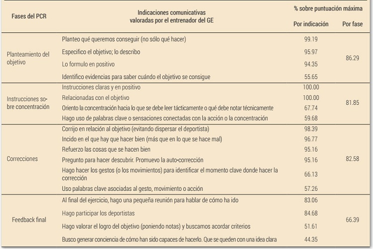 El entrenador del GE, aparte de valorar globalmente el seguimiento realizado de cada fase del PCR, también valoró al final de cada entrenamiento el seguimiento de cada una de las indicaciones comunicativas, registrando si había seguido cada indicación, si lo había hecho a veces, o no la había seguido. En la Tabla 2 se muestra el porcentaje de seguimiento para cada indicación comunicativa en relación con la puntuación máxima posible.
