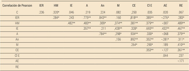 Las correlaciones bivariadas entre cada una de las variables estudiadas se observan en la Tabla 1.