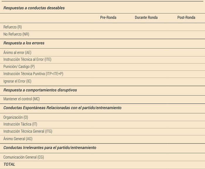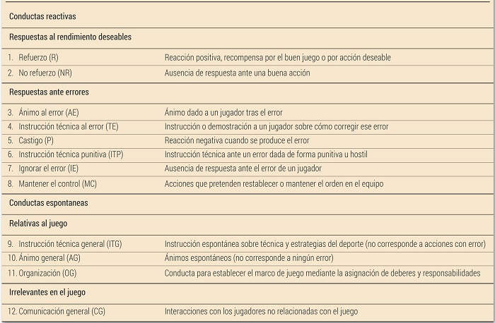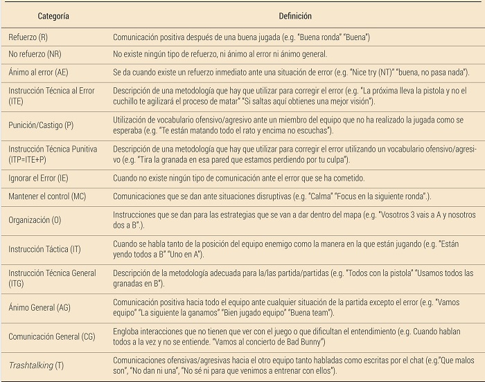 Pese al interés suscitado, cabe destacar que no se ha encontrado un protocolo o herramienta adecuada para evaluar la comunicación ingame. Mendoza (2019) propuso un modelo que incluye: a) preguntar (solicitar información para sí mismo o el equipo), b) responder (responder una pregunta u orden del compañero), c) corregir (plantear la solución a un error cometido), d) informar (dar una información u orden relevante para ese momento) y, e) reforzar (apoyar verbalmente una buena jugada). Cualquier mensaje que no entre en ninguna de esas categorías es considerado como ruido y se considera que obstaculiza el entendimiento mientras se juega. Estas categorías propuestas por el autor se fundamentan en los patrones de comunicación de Nonose et al. (2015). Por otro lado, en el ámbito de la psicología del deporte existe el Coaching Behavior Assessment System (CBAS) (Smith et al., 1977), instrumento (ver Tabla 1) que permite la observación y análisis del comportamiento y conductas del entrenador en el entrenamiento y en la competición. Ha sido utilizado en España en numerosos estudios con una alta fiabilidad y validez de constructo (Conde, 2010; Cruz, et al. 2011; Mora, et al, 2013; Sousa, et al. 2006; Torres et al. 2008).