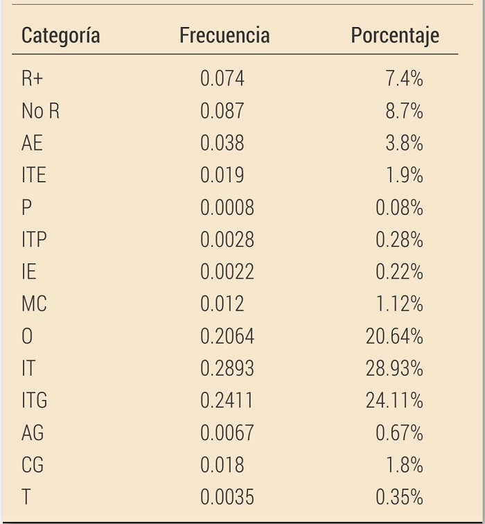 En la Tabla 4, podemos apreciar las frecuencias de las diferentes conductas analizadas, cabe destacar que no se distribuyen de manera homogénea teniendo algunas conductas como O (20.64%), IT (28.93%) y ITG (24.11%), un peso elevado en la comunicación del equipo (73.68%).