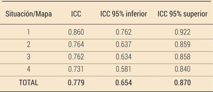 Además, podemos observar que el índice de correlación intraclase (ICC) en las 4 situaciones comentadas anteriormente (ver Tabla 5), siguiendo la clasificación propuesta por Koo y Li, (2016), oscila entre .70 y .90. Si tenemos en cuenta el sumatorio de todas las observaciones en las diferentes situaciones obtenemos un índice de acuerdo de .779, mostrando un grado de acuerdo bueno.