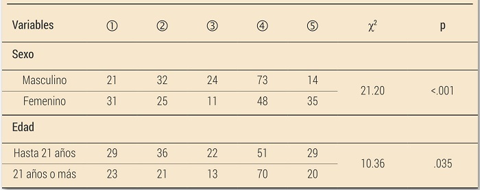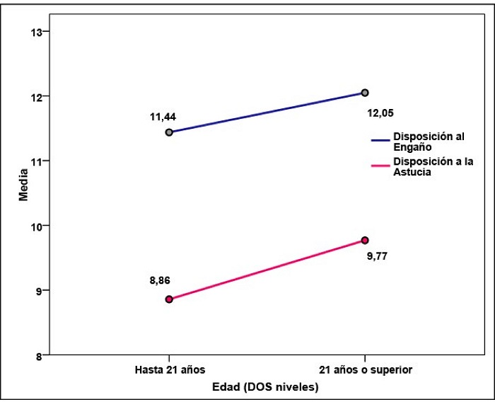Se identifica que existe mayor disposición a la astucia (U=9983.5, p=.004) en las mujeres que en los hombres (Gráfico 1). Igualmente, se encontró mayor disposición a la astucia (U=10574.5, p=.033) en los deportistas de 21 años o más, que en los más jóvenes (Gráfico 2). No se han dado otras diferencias de interés estadístico.