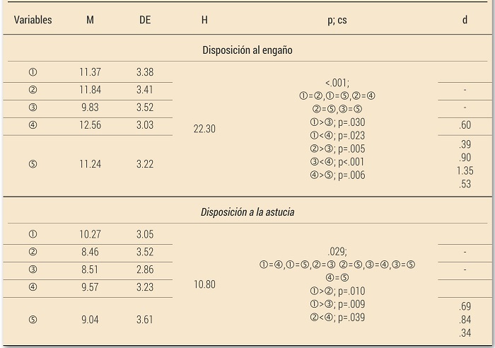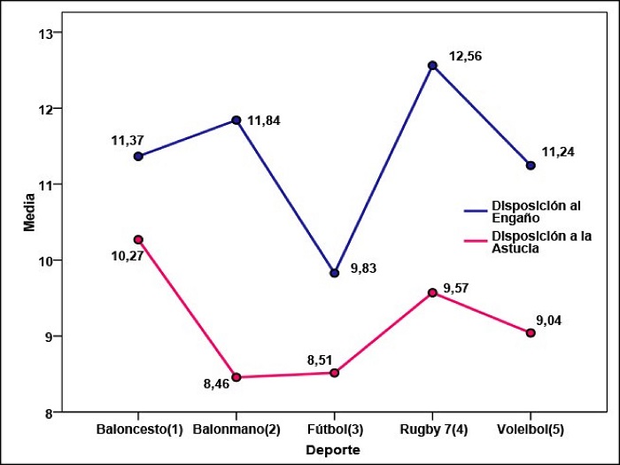 Al centrar el análisis en las posibles diferencias habidas en las disposiciones al engaño y a la astucia en función del deporte practicado (Tabla 4) se evidencian los siguientes valores: