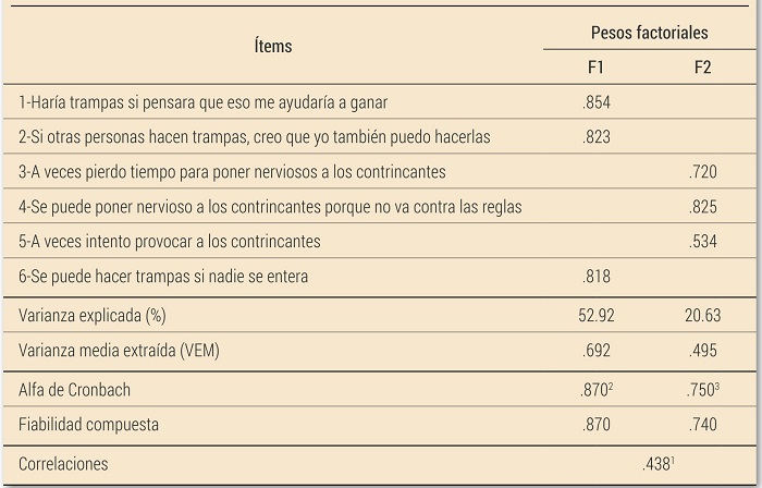 Mientras que el instrumento original CDED obtuvo una fiabilidad (alfa de Cronbach) de .78 para la globalidad de ítems, la subescala Aceptación del engaño de .74 y la de Aceptación del uso de la astucia de .63, para la presente muestra los resultados fueron de .817 para la globalidad de ítems, de .870 (categorizados como buenos) para la primera subescala y de .750 (categorizado como aceptable) para la segunda (George y Mallery, 2003; González y Pazmiño, 2015; Nunnally y Bemstein, 1994), mejorando en ambos casos los valores originales (Tabla 2).