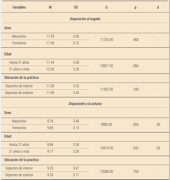 Para el análisis comparativo en las disposiciones al engañó y a la astucia (Tabla 3) según sexo, edad y ubicación de la práctica deportiva, tras la verificación del incumplimiento de la condición de normalidad, se observan los siguientes resultados: