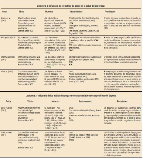 Los resultados de esta revisión sistemática, basada en 16 estudios entre los años 2013 y el 28 de enero de 2025, destacaron la influencia de los estilos de apego (seguro, ansioso y evitativo) en el contexto deportivo. Pudiendo agruparse los estudios finales (ver Tabla 2 en Anexo 1) en tres clústeres de resultados: (1) Influencia de los estilos de apego en la satisfacción de necesidades psicológicas básicas y bienestar del deportista; (2) Contextos relacionales específicos en el deporte desde la perspectiva de los estilos apego; (3) Impacto de los estilos de apego en la salud física y psicológica del competidor.