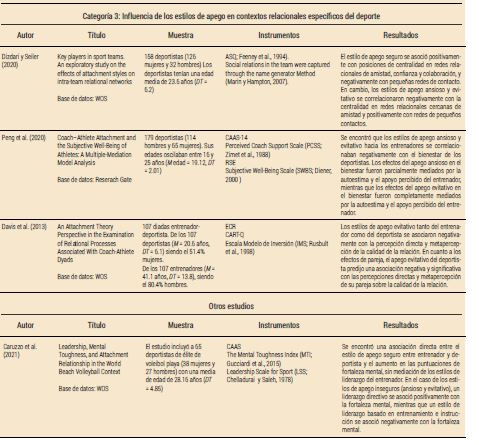 En relación con los objetivos de esta revisión y basándonos en los resultados obtenidos, este trabajo constituye una recopilación de los principales estudios publicados a nivel internacional desde el el 1 de enero de 2013 hasta el 28 de enero de 2025, sintetizando los estudios existentes sobre la influencia de los estilos de apego en los deportistas de competición. Asimismo, esta revisión pretende servir como un aliciente para promover el marco teórico del apego en el contexto aplicado de la psicología del deporte, ya que no se han encontrado investigaciones previas que aborden esta temática en profundidad en muestras de deportistas españoles o publicaciones por autores españoles, lo que pone de manifiesto un vacío en la literatura científica actual, a excepción del estudio de Caruzzo et al., (2021) donde incluye una muestra mínima de jugadores de voley playa españoles.