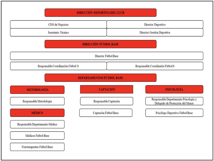 Durante la temporada 2020-2021, el R.C.D. Mallorca, en el marco de un proceso más amplio de reorganización de la estructura del fútbol base, decidió contar con la creación del Departamento de Psicología. Las bases para su fundación fueron: (a) A nivel jerárquico, que su lugar en el organigrama tuviera la misma importancia en el proceso de toma de decisiones estratégicas que el resto de los departamentos (ver Figura 1); y (b) A nivel de misión y objetivos, que su cometido se centrara en la promoción de un desarrollo holístico y una buena salud mental de los jóvenes deportistas que conforman la academia de fútbol del R.C.D. Mallorca.
