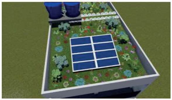 Avanzando hacia el tercer sistema, se integró el proceso de instalación de techos verdes, los cuales corroboran la conservación del medio habitual y el aire, dando una apariencia agradable y funcional, como complemento al sistema de paneles solares. Las ventajas del sistema diseñado son evidentes, pues por un lado se aprovechó el espacio de las cubiertas y por el otro se disminuyó la temperatura del área construida y de su exterior. Según Hans J. Seeger [13], actual Presidente de la Asociación de Jardineros de Cubiertas y Tejados de Alemania, la temperatura exterior puede reducirse hasta 8 grados centígrados en áreas con cubiertas verdes conforme a los estudios realizados en Estados Unidos y Alemania [13].