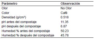 La humedad de la pila al iniciar el proceso de compostaje fue de 50.23% y al Analizar fue 45.78%, se mantuvo en el intervalo óptimo para su descomposición de acuerdo a lo reportado por Guerrero (2007)[16].