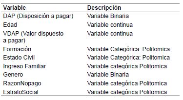 El modelo estadístico se basa en el análisis de una regresión logística la que permite analizar los problemas en los cuales hay una o más variables independientes que determinan un resultado que se mide con una variable dicótoma que toma solamente dos posibles resultados, para el caso de la medición económica de un recurso natural determinado por la metodología de la valoración contingente, la variable dicotómica está dado por el DAP (usted está dispuesto a pagar por: Si_No_).