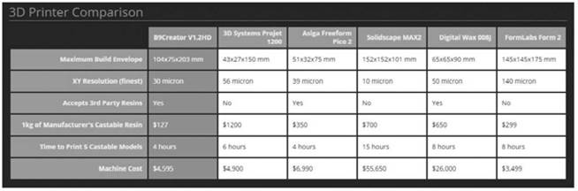 Como puede observarse son varios los aspectos a tener en cuenta y no es tan sencillo como elegir por costo una de las impresoras disponibles en el mercado. La Tabla 1, tomada de [27] muestra un comparativo entre las impresoras 3D más comunes para joyería, es importante aclarar que las impresoras 3D que funcionan con filamento plástico no son adecuadas para fabricación de joyas.