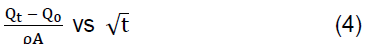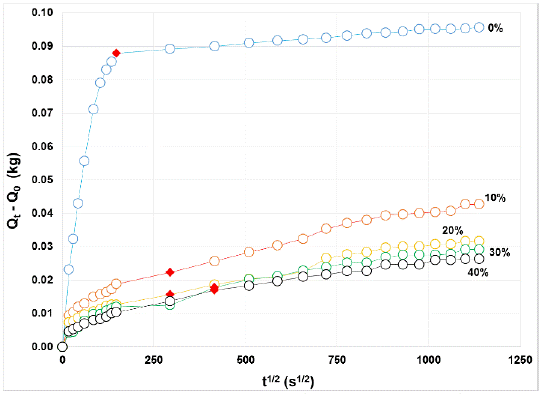 Además, la velocidad de absorción capilar S se estimó como la pendiente de una recta entre el origen y el punto crítico de saturación en la gráfica definida por la ecuación (4), según la norma ASTM C1585-04 [3]: