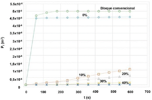 Se hicieron también ensayos de penetración de agua con el método RILEM CPC 11.2 [1] para determinar la penetración de agua en los bloques de concreto. Todos los bloques fabricados en esta investigación son aligerados con perforación vertical y tienen una anchura de 120 mm, una altura de 200 mm y una longitud de 400mm. Se estudiaron 20 bloques sin adición de emulsión de parafina y 80 bloques con 10%, 20%, 30% y 40% de adición de emulsión de parafina respecto al peso del cemento. En la fabricación de los bloques y de las probetas, la emulsión de parafina es mezclada con el agua y posteriormente es incorporada a la mezcla de cemento y arena. Para los ensayos de penetración de agua se utilizó una pipeta de Karsten de 1 cm2 de área transversal y una capacidad volumétrica de 5 cm3. La pipeta se adhiere a la superficie de los bloques de concreto usando una masilla impermeable. Inicialmente, se garantiza que la superficie de los bloques se encuentre seca y limpia y se verifica la ausencia de fugas entre la pipeta, la masilla impermeable y la superficie de contacto del bloque. También se evaluó la penetración de agua en 20 bloques convencionales, de una marca reconocida, adquiridos en el mercado. Se cuantifica la penetración de agua durante 10 minutos, se registran y grafican los resultados, Fig. 3.