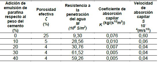 Se evidencia que la adición de emulsión de parafina reduce drásticamente la absorción capilar de las muestras. Hay una disminución de la porosidad efectiva mayor que 80%, una disminución del coeficiente de absorción capilar mayor que 87% y una disminución de la velocidad de absorción capilar mayor que 90% para todas las probetas con adición de emulsión de parafina respecto a las probetas sin adición. Los mejores resultados se obtienen entonces con al menos un 10% de adición de emulsión de parafina. La incorporación de emulsión de parafina contribuye notablemente a disminuir la absorción capilar en los morteros y concretos que los incorporan.