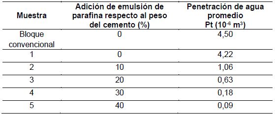 Se determinó que los bloques con emulsión de parafina presentan mejores propiedades que los bloques convencionales sin aditivos y que podrían reducir los problemas de humedad en los muros pues tienen un coeficiente de absorción capilar bajo.