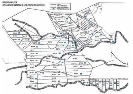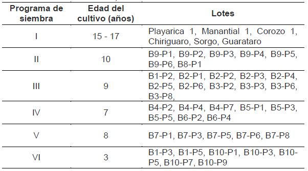Localización, selección y ubicación de lotes. El estudio se llevó a cabo en jurisdicción del municipio de Barranca de Upía, departamento del Meta, Colombia sobre un área de 1890 hectáreas a 250 msnm. El área de estudio se distribuye en 94 lotes que, a su vez, se agrupan en siete programas de siembra de acuerdo a la época en que fueron establecidos los cultivos. Teniendo en cuenta estos aspectos y considerando los niveles de incidencia de PC en los diferentes lotes, se realizó la distribución de los puntos de muestreo en 42 lotes tomando un punto cada 45 hectáreas, de manera tal que se contemplara toda el área cultivada, todos los programas de siembra y los diferentes niveles de incidencia de PC, Fig. 1. De igual manera los programas de siembra, las edades del cultivo y los lotes considerados en el desarrollo de la investigación se presentan en la Tabla 1.