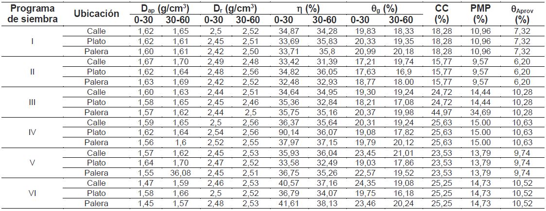 En la Tabla 2 se presentan los resultados promedio obtenidos de las propiedades físicas de los suelos en las zonas de calle de cosecha, plato y palera para los programas de siembra establecidos en la totalidad del cultivo.