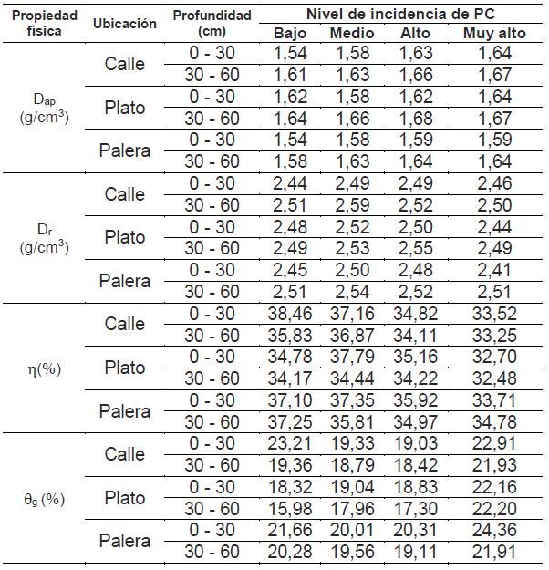 De igual manera en la Tabla 3 se presenta los resultados obtenidos entre los niveles de incidencia de PC y las propiedades físicas promedio de los suelos para las zonas de calle, plato y palera.