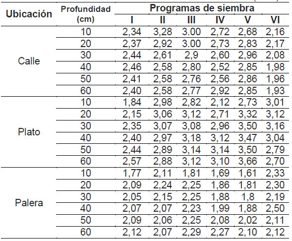 Para la zona de calle los programas de siembra II, III, IV y VI el mayor valor de índice de cono se presentó a nivel superficial hasta los 20 cm de profundidad, mientras que en los programas I y V el mayor valor se presenta aproximadamente alrededor de los 30 cm de profundidad, lo cual indica que para la zona de calle las capas endurecidas por efecto del tráfico alcanzan profundidades de aproximadamente 30 cm. En la zona de plato se presenta un incremento el índice de cono con la profundidad, reportándose valores iguales o superiores a los 3,0 MPa alrededor de los 30 cm de profundidad para todos los programas de siembra a excepción del programa de siembra I.