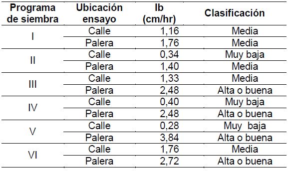 En la zona de palera ocurre lo contrario; la infiltración básica fue muy alta en el 19% de los puntos donde se realizaron los ensayos, alta o buena en el 38%, media en el 17%, baja en el 14% y muy baja en el 12%. Para la zona de calle de los programas de siembra II, IV y V se presentaron velocidades de infiltración básica muy bajas, los programas I, III y IV velocidades de infiltración básicas medias; mientras que en las zonas de palera los programas I y II presentaron infiltraciones básicas medias y los programas III, IV, V Y VI infiltraciones básicas altas o buenas, lo cual indica mejores condiciones del suelo para la infiltración en estos últimos programas.