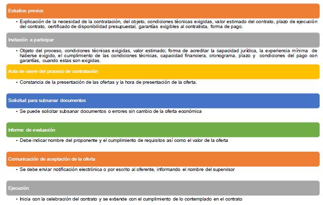 El procedimiento para establecer la mínima cuantía de una Entidad Estatal se puede derivar de lo señalado para la menor cuantía, según literal (b) del artículo 2 de la Ley 1150 de 2007, Tabla 1. Los documentos requeridos en este tipo de proceso se resumen en la Fig. 1.