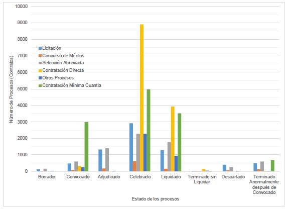 En Colombia, la contratación por mínima cuantía en el sector G, objeto de este estudio, representó el 27.5% de los 44.208 procesos en las diferentes modalidades de contratación en el país y el 35.62% (677procesos) del total de procesos terminados después de convocados (1901 procesos) en las diferentes modalidades de contratación (Fig. 2).
