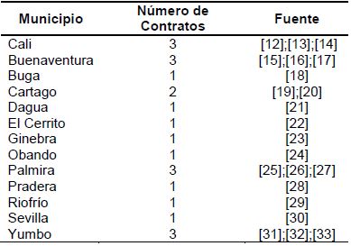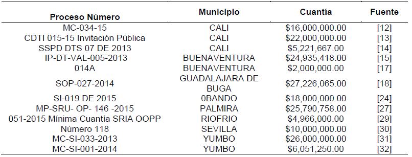 Esta investigación de tipo cualitativo y descriptivo es desarrollada por el grupo de investigación DeCor y el semillero de investigación en Gestión de Obras de la Pontificia Universidad Javeriana Cali, la cual busca la Calificación de los Procesos de Gestión de Obras Públicas y Privadas en el Valle del Cauca en el periodo comprendido entre el 2010 y el 2015. La modalidad de contratación por Mínima Cuantía hace parte de los resultados del estudio en el cual se revisaron los procesos que presentaron el estado de terminado después de ser convocados tal como se muestra en la Tabla 2.