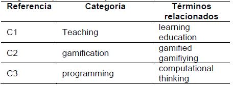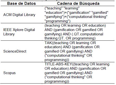 Para crear la cadena de búsqueda, se utilizaron las palabras clave (i) que figuran en las preguntas de la investigación, (ii) extraídas de documentos destacados, y, (iii) obtenidas a partir de una pequeña entrevista con expertos en el tema. El resultado se muestra en la Tabla I. Se definieron tres palabras clave principales: "teaching", "gamification" y "programming"; cada palabra clave forma una categoría que contiene sus respectivos términos relacionados.