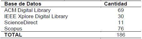 El motor de búsqueda de cada base de datos seleccionada utiliza diferentes mecanismos y estándares. Por lo tanto, se adaptó la cadena de búsqueda a cada base de datos, como se muestra en la Tabla II, para llevar a cabo búsqueda avanzada en títulos, resúmenes y palabras claves de artículos, obteniendo así un primer conjunto de estudios primarios.