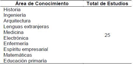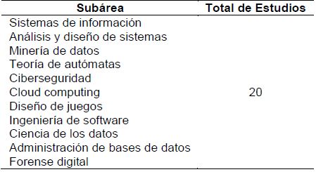 La categoría "General" relacionada con la aplicación de la estrategia en otras áreas del conocimiento (ver Tabla IV), también está bien explorada en la literatura con un total de 25 estudios. Es importante anotar, que un número significativo de estudios, 20, se relacionan con la aplicación de la estrategia en diferentes subáreas de las Ciencias de la Computación (ver Tabla V), sin tener en cuenta a la Programación.