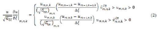 Los términos del momentum en el plano horizontal en una malla tipo Z están aproximados por diferentes métodos. Las discretizaciones de Explicit MultiDirectional Upwind (MDUE) y Implicit Multi-Directional Upwind (MDUI) [3]. La discretización del flujo con un componente U y V (que son velocidades horizontales promediadas en la vertical) positivos viene dada por las ecuaciones (2) y (3), donde
