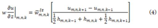 En plano vertical, las capas adyacentes están acopladas por la advección vertical y el término de viscosidad vertical. En la dirección vertical, el término eddy viscosity en flujos estratificados la advección puede ser dominante porque el intercambio turbulento se reduce. Para esta se usa una diferencia central de segundo orden (4).