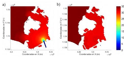 En la Fig. 10a se observa la distribución de la salinidad en la bahía de Cartagena, teniendo en cuenta las condiciones de viento y caudal promedio correspondiente a la época húmeda. La Fig. 10b es una vista de las capas inferiores de aproximadamente un metro de profundidad, que demuestra que el agua proveniente del canal del Dique se encuentra mayormente en las capas más superficiales. El flujo del canal, entre otras cosas, determina la dispersión de la salinidad en la bahía, pero esta también se ve influenciada por el viento, notando como la salinidad se distribuye en mayor parte hacia la salida por Bocagrande, como se muestra en la Fig. 10a.