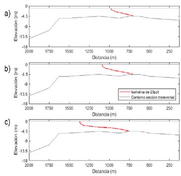 La estratificación en la desembocadura puede presentar variaciones que se atribuyen, principalmente, al aporte de agua dulce del canal del Dique, en las épocas seca, de transición y húmeda que se presentan en la región. Con respecto a los datos simulados en este trabajo, la dinámica de la estratificación se presenta en la Fig. 12, donde se muestran las isohalinas de 20 ppt con respecto a los caudales bajos, promedio y máximos en la simulación.