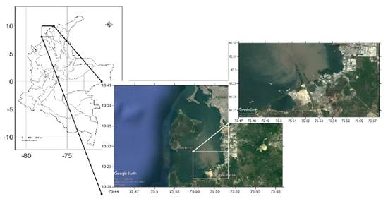 La zona de estudio se encuentra ubicada en el municipio de Pasacaballos, al sur de la ciudad de Cartagena, entre las coordenadas 10°16'57,50" y 10°18'23,93" latitud norte y 75°31'16,59" y 75°32'11,11" longitud oeste, en el punto de la desembocadura del canal a la bahía de Cartagena, como se ve en la Fig. 2.