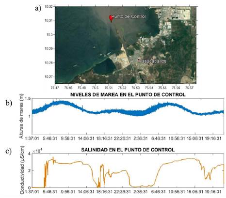 En el punto de control se ubicaron dos sensores para recolectar datos de salinidad y de profundidad del agua, ambos instalados a 0,8 m de la superficie; un sensor HOBO U24-002-C para captar los datos de salinidad a una frecuencia de 30 segundos (Fig. 3, c); y para recolectar los datos de profundidad, un sensor DCX-25 PVDF con una frecuencia de 1 segundo (Fig. 3, b).
