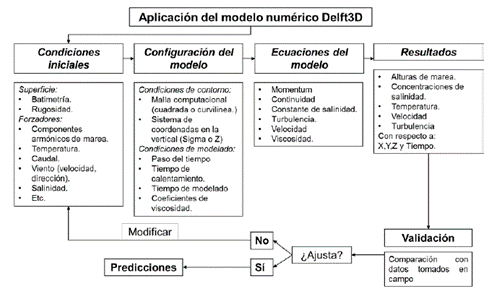 El software de modelación numérica usado para analizar el comportamiento de la estructura salina fue Delft3D, el cual se centra en la modelación de entornos fluviales y costeros. Desarrollado por el Instituto Holandés de Asuntos Deltaicos Nacionales e Internacionales (Deltares) en el 2008, este simula flujos en dos y tres dimensiones, aplicando flujos no-estacionarios e integrando efectos de marea, viento, presión atmosférica, densidades que se dan por diferencia de temperatura y salinidad, oleaje y turbulencias. Este modelo numérico hidrodinámico resuelve las ecuaciones de Navier-Stokes en una malla curvilínea adaptada a la forma del ecosistema [12].