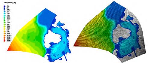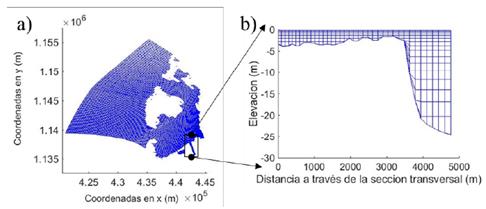 Se construyó una malla de cálculo curvilínea en la horizontal, que se ajusta a la forma y los requerimientos para la simulación, la malla se conforma por un total de 122 por 102 celdas, con celdas de hasta 50 m en la desembocadura del canal (Fig. 6, a). En la vertical se usaron coordenadas Z; se discretizó en 40 capas distribuidas en porcentajes diferentes con respecto a la distancia en la vertical, con el fin de lograr el mayor número de capas en la desembocadura del canal, obteniendo una distribución de 0,20 m en las capas más superficiales y 25 m en las más profundas; sin embargo, en la desembocadura, la última capa es de 1.7 m, consiguiendo así un nivel de resolución óptimo en la vertical para la descripción de la estratificación (Fig. 6, b).