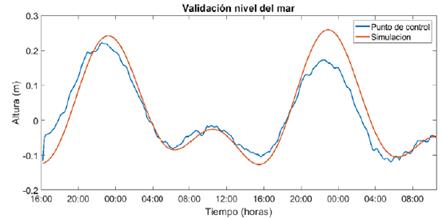 Para la validación del modelo hidrodinámico se tuvo presente la frecuencia de salida de los datos de la simulación, que es cada hora, por lo que se hizo necesario promediar los datos de salinidad y niveles del agua originales. En los resultados de profundidad se obtuvo una correlación de 97%, como se muestra en la Fig. 7, a pesar de que los datos simulados son con datos promedios. En general, los resultados de la simulación en la bahía obtuvieron niveles entre 0.01 a 0.28 m.