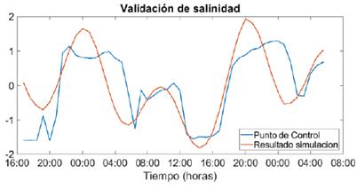 De modo similar, para las mediciones de salinidad en el punto de control en el canal del Dique se tiene una variación de 0 a 17 ppt, mientras que en la simulación se obtuvo una variación entre 3.25 y 17.34 ppt; sin embargo, se observa en la Fig. 8 una similitud en la variación de los datos. Debido a que las unidades de salinidad del sensor y de la simulación son diferentes, los datos fueron normalizados para su comparación.