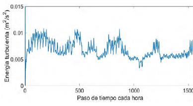La simulación se realizó durante 65 días, en este periodo de tiempo la estabilidad del modelo se logra cuando la variación en la turbulencia es mínima; dicho estado se alcanza durante los 2 a 5 primeros días de simulación del modelo, como se observa en la Fig. 9. Las variaciones u oscilaciones que se observan corresponden a lo generado por los cambios inducidos por el régimen de la marea.