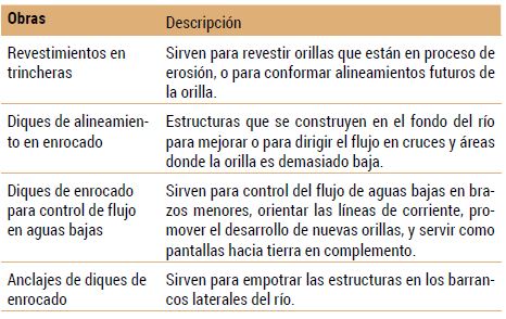 Estructuras de encauzamiento: las obras de encauzamiento utilizan la metodología que el Cuerpo de Ingenieros de los Estados Unidos manejada en el río Mississippi. Las obras consisten en un conjunto de revestimientos en trinchera, diques de alineamiento y enrocado, y anclajes de diques de enrocado, para minimizar la dispersión de los caudales en tiempos de sequía y concentrarlos en un solo canal principal más profundo y operativo [22].
