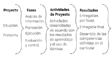En la metodología de formación del SENA los aprendices deben realizar un proyecto formativo, el cual les permite ejecutar actividades agrupadas en fases similares a las que desarrollarán en el sector productivo y que están alineadas con el ciclo PHVA (planear, hacer, verificar y actuar) [7]. Mediante la realización del proyecto formativo, se evalúa el proceso de aprendizaje y la adquisición de competencias laborales al considerar los resultados que los aprendices deben demostrar en sus actividades de formación. En este, se busca que los aprendices resuelvan una situación o problema siguiendo un paso a paso que les permite: (a) realizar el análisis de la situación a resolver e informarse sobre ella, (b) planear la mejor forma de llevar a cabo esa solución, (c) establecer planes de acción, (d) ejecutar las actividades planeadas y (e) evaluar el cumplimiento y efectividad para el logro del objetivo planteado. En el proyecto de formación se deben aplicar las competencias que agrupan los conceptos, principios y procesos que están asociados a los resultados de aprendizaje de las diferentes fases y actividades [8]; en la Fig. 1 se representan los componentes de la metodología de la formación por proyectos utilizada en el SENA.