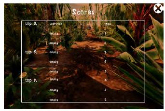 En la Fig. 10 se encuentran las imágenes que se piensan desbloquear posteriormente a medida que el jugador puede llegar cada vez más lejos. Un botón con una X en la esquina superior derecha abre nuevamente el menú principal (Fig. 4). Por el momento solo se tiene el diseño de esta tabla de score (Fig. 11), aún no muestra realmente el registro de los nombres de jugador ni de las distancias que recorrieron.