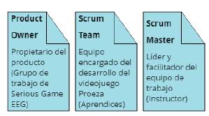 En la producción del videojuego se usó SCRUM, un método ágil de desarrollo de software que facilita la gestión de un equipo de trabajo para alcanzar la mayor productividad posible. Este marco de trabajo permite la coordinación de los programadores y otorga la flexibilidad de escoger la mejor opción para realizar el trabajo al dividir un proyecto en pequeñas actividades que componen un sprint, lo cual simplifica el seguimiento al progreso de la ejecución del cronograma planteado [11], [19]. Se asignaron los siguientes roles: el equipo desarrollador (Scrum Team), dueño del producto (Product Owner), el líder del equipo desarrollador o mentor (Scrum Master) [20]. El equipo desarrollador del video-juego Proeza fue descrito en el apartado anterior. El propietario del producto en este caso es el grupo de trabajo del proyecto "Serious Game EEG", quien participó de manera activa en el proceso de desarrollo con el fin de facilitar el trabajo de los desarrolladores, estando siempre atentos a resolver las inquietudes que se pudieran presentar en aspectos prioritarios y relevantes para el logro del resultado esperado. El instructor cumplió con el rol de Scrum Master o facilitador y fue quien direccionó al equipo hacia el cumplimiento de las actividades planeadas para garantizar la calidad en el trabajo [11], [21], [22]. En la Fig. 2 se ilustran los roles de la metodología SCRUM.